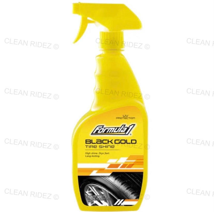 Make your car tires look brand new with Formula 1 Black Gold Tire Shine. This powerful spray gives your tires a deep black finish and a high-gloss shine that lasts for weeks. It not only makes your car look great but also protects tires from cracking, fading, and dirt.